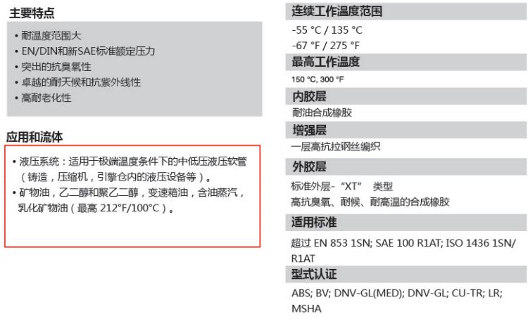 主要特点:耐温度范围大;EN/DIN和新SAE标准额定压力;突出的抗臭氧性;卓越的耐天候和抗紫外线性;高耐老化性;应用和流体:液压系统:适用于极端温度条件下的中